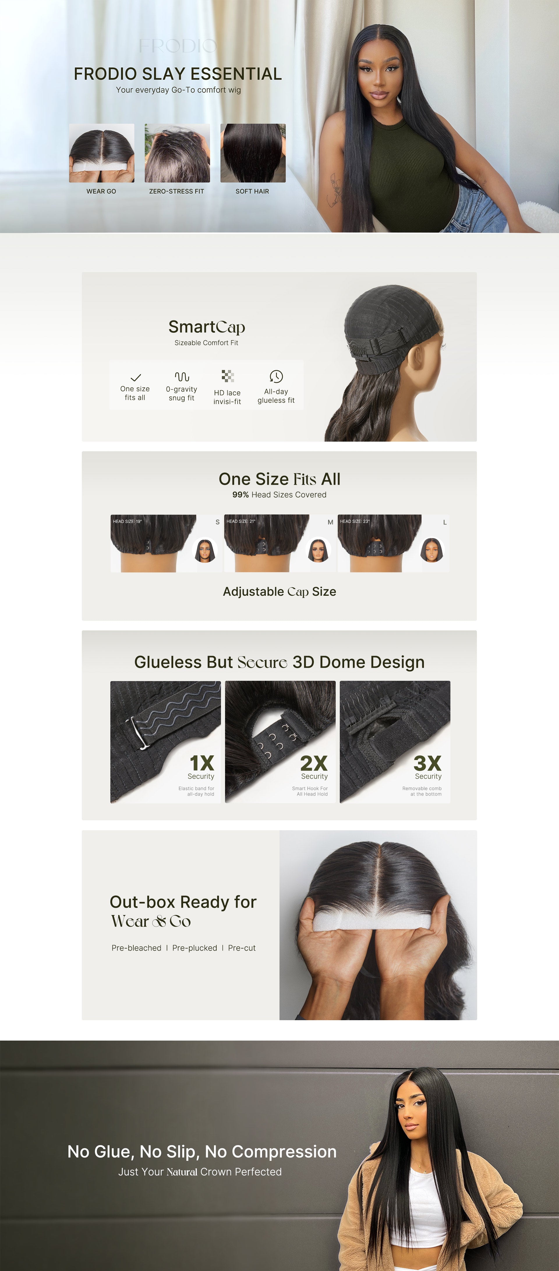 Frodio 100% Human Hair Silky Straight Glueless Flexfit Drawstring Wig Fits All Head Size