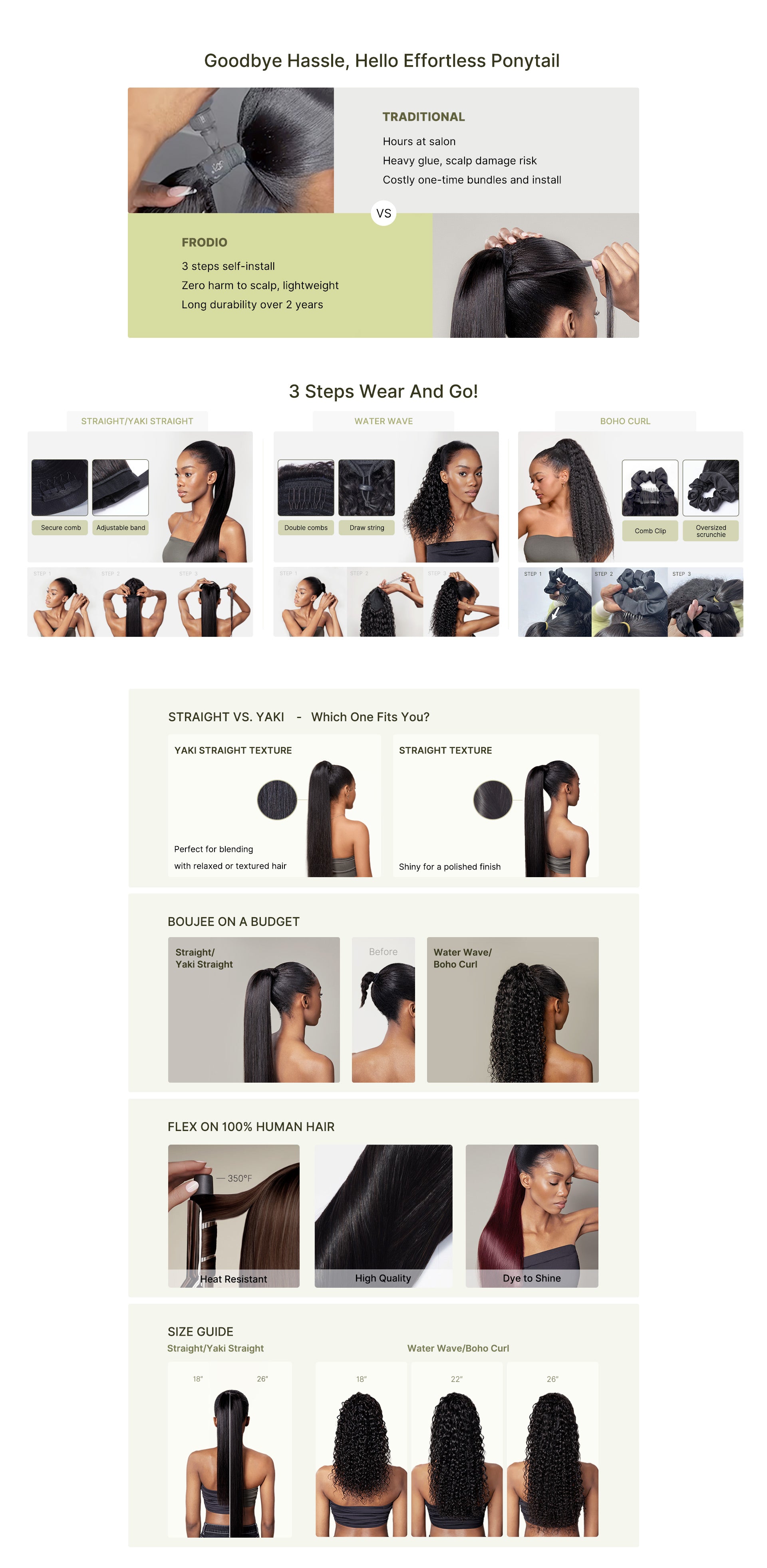 Frodio 100% Human Hair High-Density 10-Sec Ponytail Hairstyle Drawstring Ponytail Hair Extensions Ponytail Black Girls