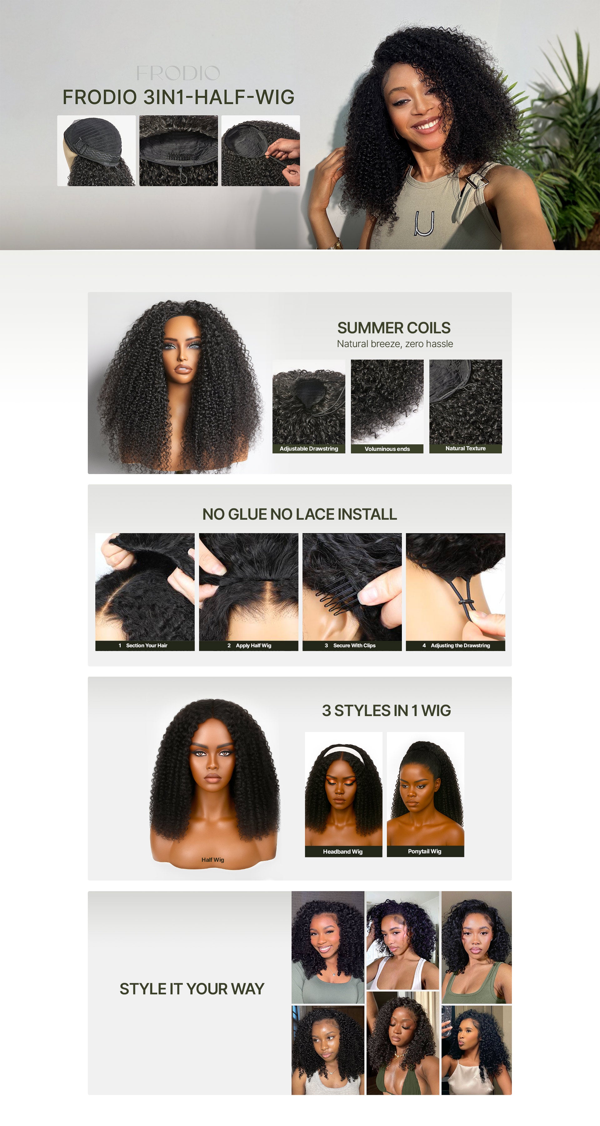 Frodio Ponytail & Kinky Curl 3-in-1 Half Wig 100% Human Hair High-Density Drawstring Extensions